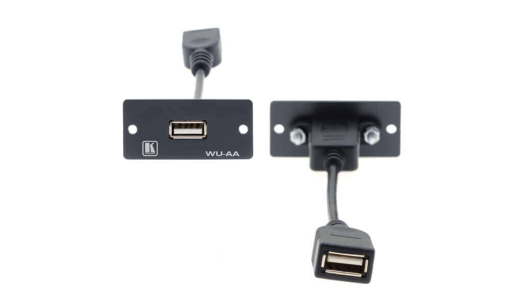 WU − AA es una placa de pared de inserción única con un conector USB (tipo A) en la parte frontal y un cable con un conector USB (tipo A) en la parte posterior.